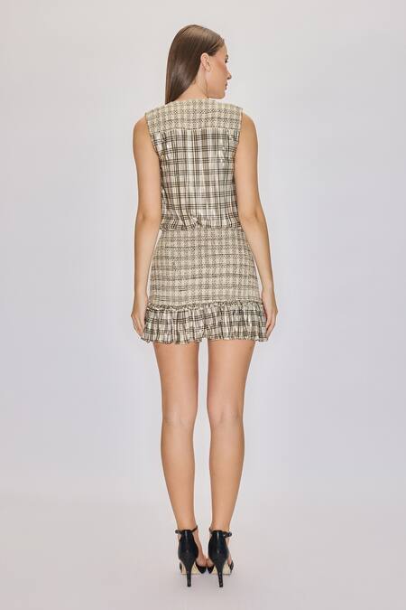 Draped front detail, Metallic checkered print, Smoked skirt design