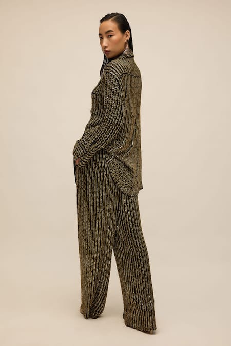 Black 100% Silk Hand Embellished Sequin Collared Shirt And Pant Set