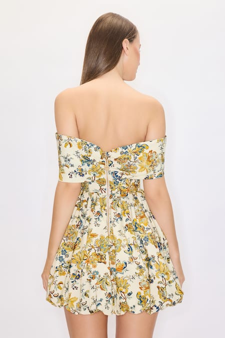 Multi color draped off shoulder corset dress featuring a floral print and bubble hem