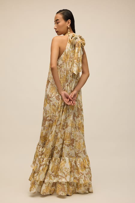 Asymmetric hemline with ruffled layers, Tie-up detail at the back, Metallic floral print design
