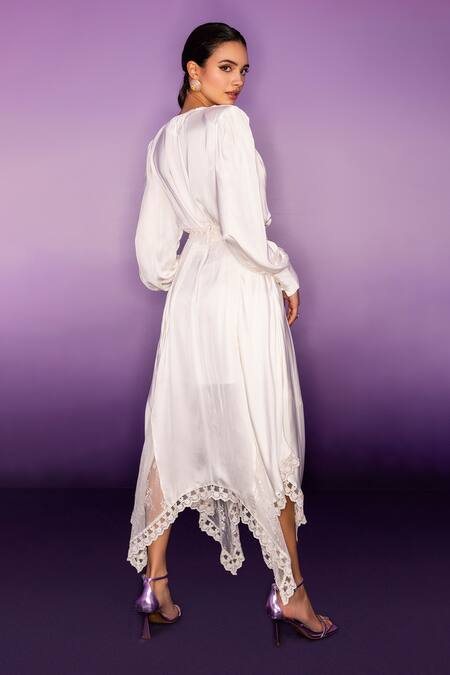 Buy_House Of Eda_Ivory Viscose Lace Plunge Neck Imara Handkerchief Hem Top And Skirt Set_at_Aza_Fashions