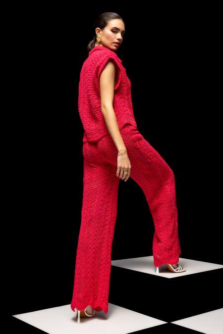 Pink hand knitted crochet shirt featuring a camp collar and cap sleeves. Paired with coordinating flared pants with a solid waistband and attached lining.