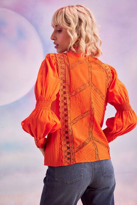 Orange top featuring high neck collar and bishop sleeves with scallop lace embroidery