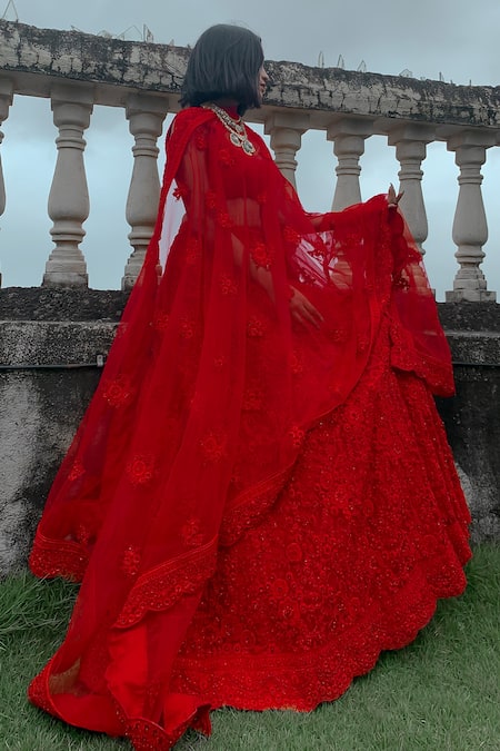 Red lehenga featuring floral and chikankari embroidery with scallop border. Paired with a padded blouse and net dupatta with placement embroidery.
