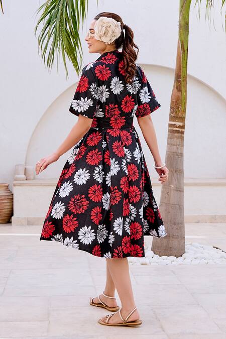 Short sleeves with a classic collar, Floral pattern in contrasting colors, Knee-length A-line silhouette