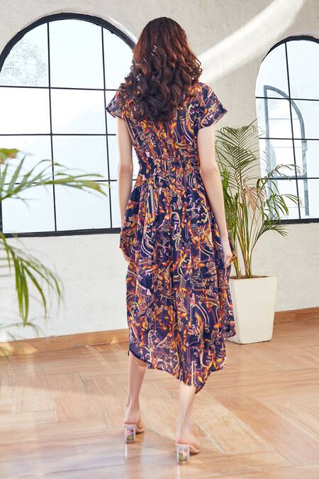 Blue midi dress featuring abstract prints with drape detailing in front