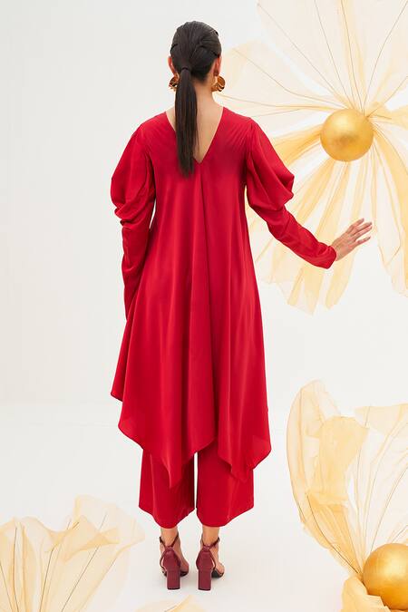 Red Satin, Lycra Sequins, Embroidery V-neck Rubyetta Tunic And Pant Set