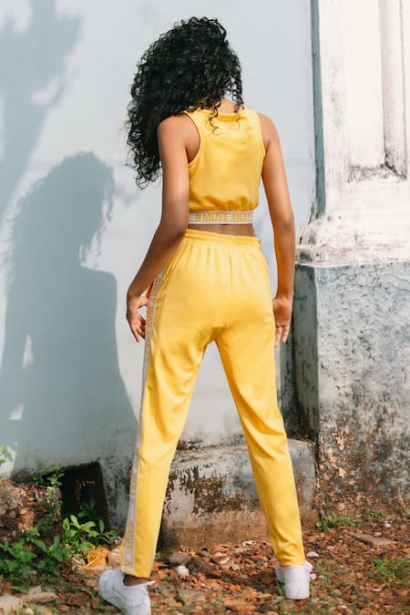 Yellow Neoprene, Polyester Embroidery Round Neck Scuba Crop Top