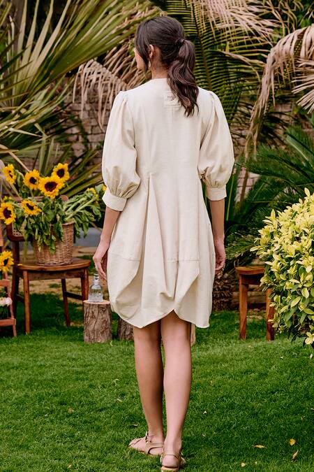 White flex dress featuring a cowl neckline and puff sleeves