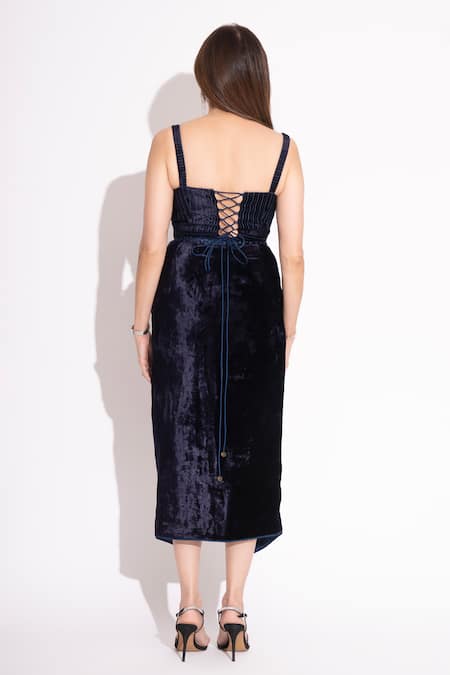 Navy blue makhmal crop top featuring a sweetheart neckline and sleeveless design. Paired with a skirt that has a side zip closure and a front slit detail.