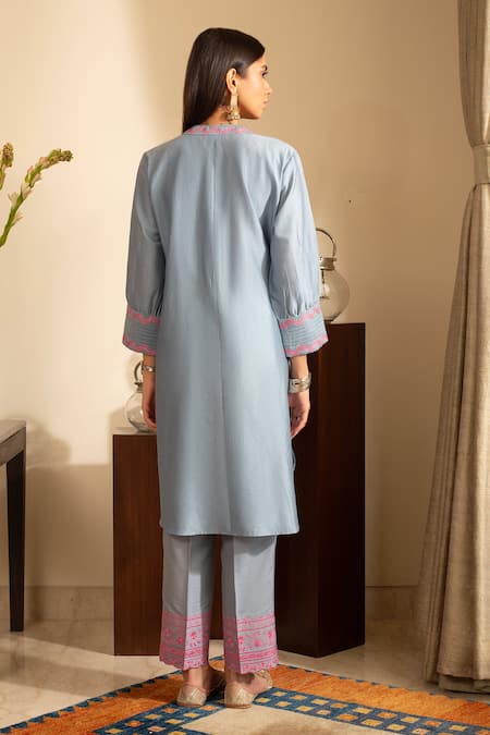 Blue Chanderi , Embroidery Collared Gul-meh Straight Kurta With Pant