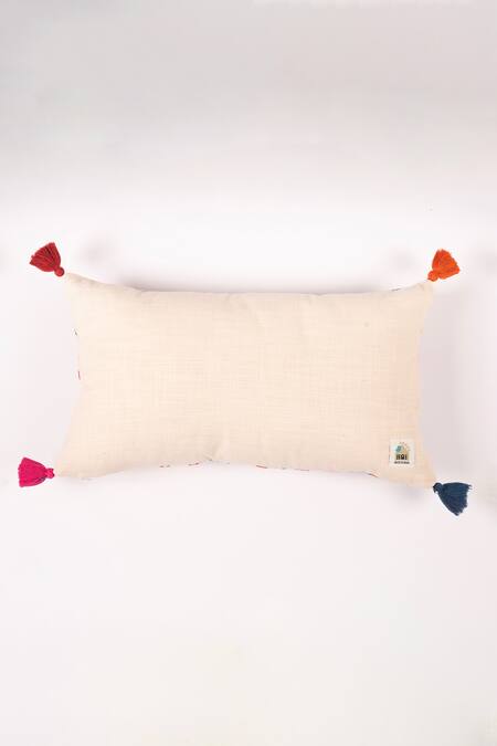 Off white elongated cushion cover with contrast tashkent suzani embroidery.
