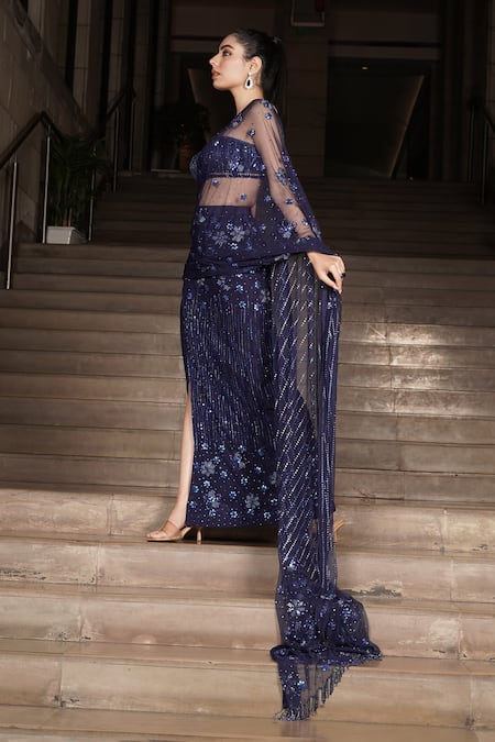 Midnight blue pre-draped saree featuring sequins and beads hand embroidery with a side slit. Paired with a blouse that has matching embroidery and a hem detailed with crystals.