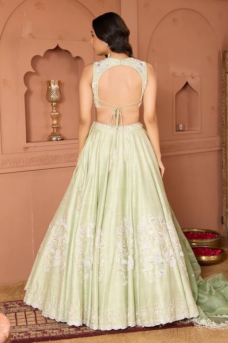 Sage green silk organza lehenga featuring floral, peacock, and lotus motif embroidery with a pearl beaded scalloped hem. Paired with a heavily embroidered plunging matka neckline padded blouse and a sheer scallop bordered dupatta.