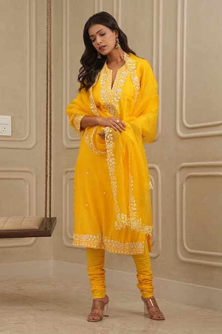Sunshine yellow straight kurta featuring heavy floral resham, nakshi and beads embroidery. Paired with a coordinating solid palazzo and cutwork border dupatta.