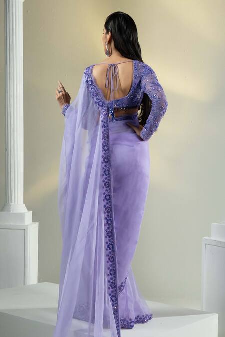 Lavender saree crafted from silk organza featuring floral motif embroidery and a lace detailed border. Paired with a fully embroidered blouse with a sweetheart neckline and full sleeves.