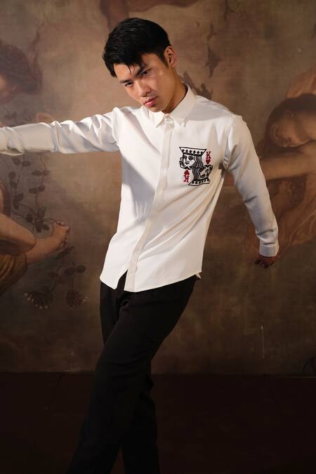 White crepe shirt featuring long sleeves and a collared neckline with placement thread embroidery