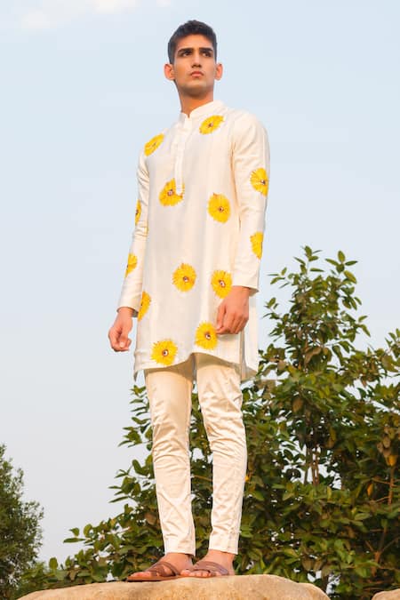 Off white kurta featuring hand painted sunflowers and a mandarin neckline. Paired with solid stretchable cotton satin pant.