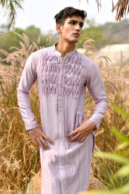 Lavender kurta featuring a textured stripe pattern and a mandarin collar. Paired with a matching churidar made of stretch cotton.