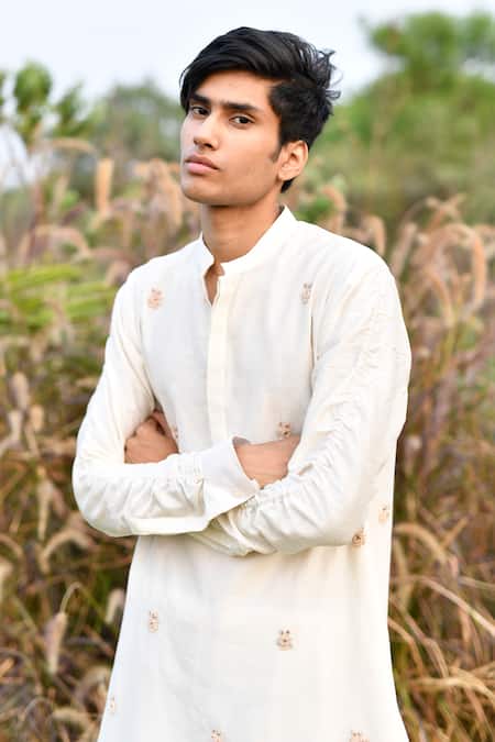 White kurta featuring zardozi scattered embroidery in rose motifs. Paired with a churidar made from stretch cotton.