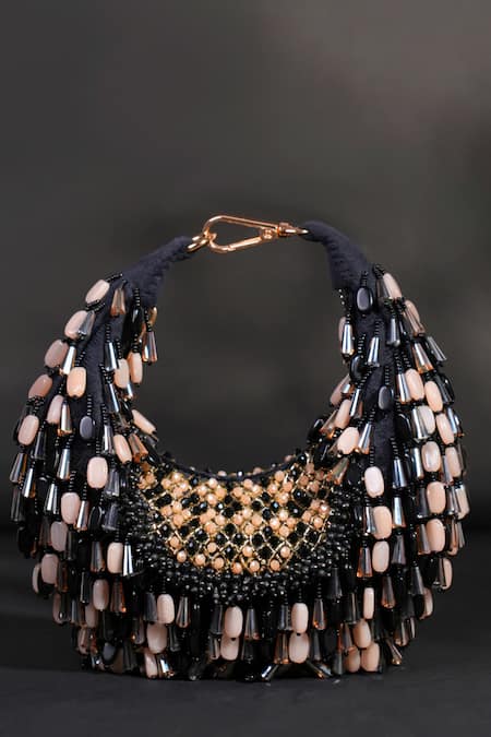 Black suede hobo bag featuring intricate beadwork and crystal hangings