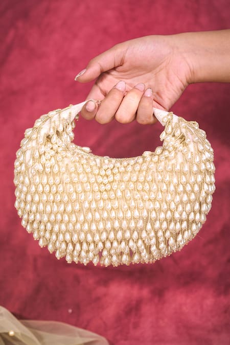 Ivory hobo bag featuring intricate beaded and pearl embellishments