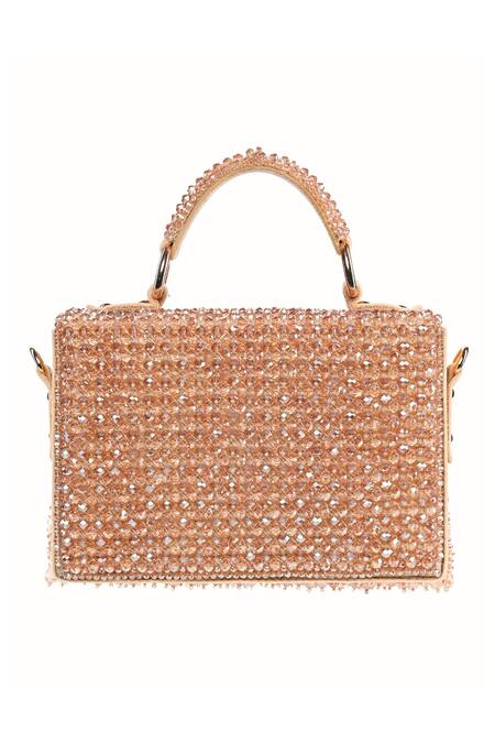Gold box bag featuring all over Quad design crystal and bead tassel embellishments. Includes a detachable crossbody chain for versatile carrying options.
