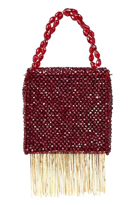 Square shape with fringe detailing, Metallic chain accents, Crystal embellishments for added glamour
