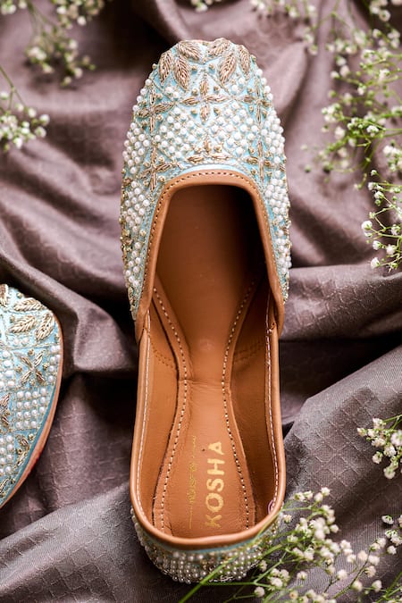 Double cushioned soles for comfort, All over floral jaal pattern, Pearl and zari hand embroidery