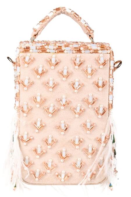 Ivory box bag embellished with pearls, crystals, and crystal hangings