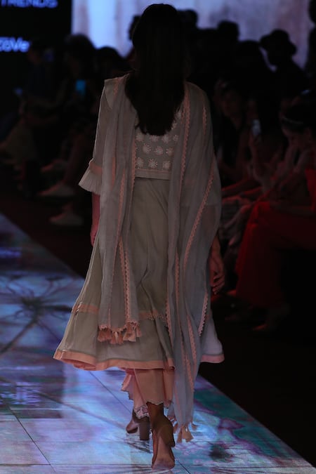 Grey koti jacket with floral motif work paired with anarkali kurta. This set comes with pink cutwork hem pants & tassel border dupatta.