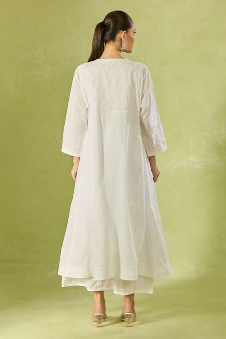 White kurta made from cotton lawn featuring intricate embroidery and a straight silhouette. Paired with matching pants and a lightweight cotton kota dupatta.