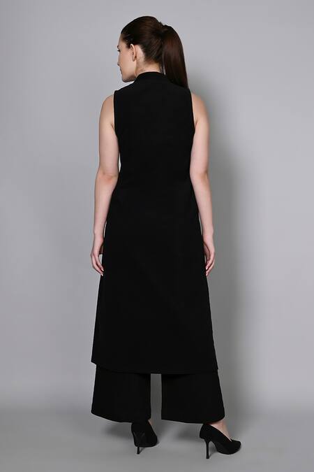 Black sleeveless kurta featuring a stand collar and tri-slit design with metallic frame embellishments on the placket. Paired with a plain flared palazzo for a cohesive look.