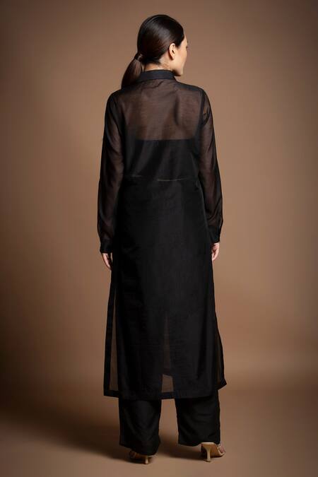 Black Silk, Chanderi Sequins Collared Yoke Hand Embroidered Long Tunic Pant Set
