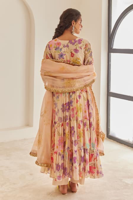 Peach anarkali featuring hand embroidered floral patterns with a notched neckline. Paired with a straight pant and a printed organza dupatta adorned with lace trims.