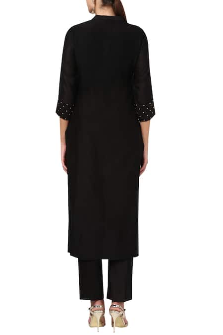 Black jacket style kurta with floral embroidered motifs. Paired with Chanderi pant.