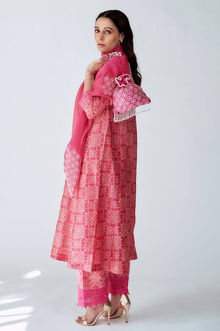 Pink chanderi printed kurta with lace detailing. Paired with palazzo, & chanderi scarf with thread work embroidery.