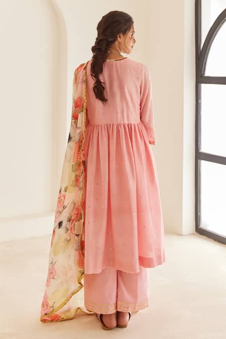 Powder pink anarkali in chanderi fabric featuring sequin embroidery and flared sleeves. Paired with matching straight pant and a printed organza dupatta.