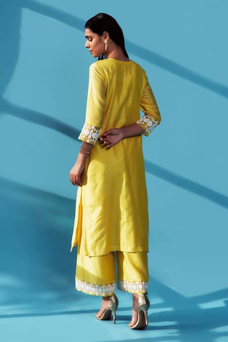 Yellow silk chanderi kurta in embroidered pearl, cutdana and sequin work. Paired with organza pearl work dupatta and palazzo pant.