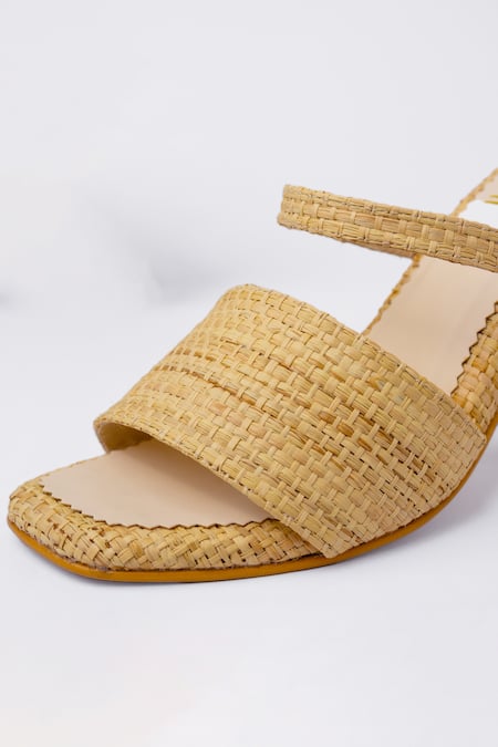 Beige hand carved heart shaped wooden heels featuring single textured abstract straps
