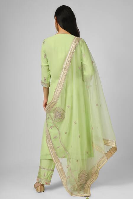 Green Organza, Silk, Viscose Embroidery Round Neck Bahar Kurta Pant Set