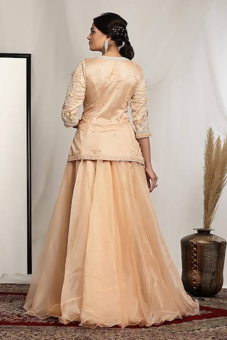 Peach kurta featuring floral embroidery with pearl and bead embellishments. Paired with a flowing lehenga in shimmer net fabric.