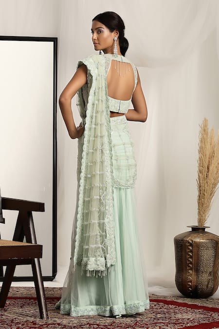 Sea green pre-draped saree featuring pearl and bead embroidery in geometric and floral patterns with a scallop hem. Paired with an embroidered blouse with tassel detailing and a back cutout.