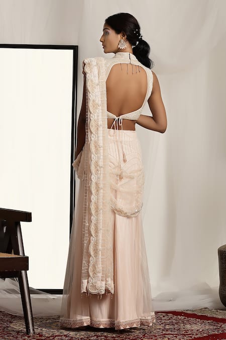 Light pink pre-draped saree featuring pearl and bead embroidery in geometric and floral patterns with scallop hem. Paired with an embroidered blouse with tassel detailing and a back cutout.