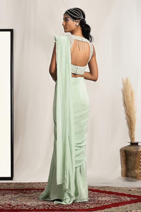 Buy_House Of Supriya_Green Crepe, Net Embroidery, Pearls, Tassels, Beads Pre-draped Saree And Blouse _Online_at_Aza_Fashions