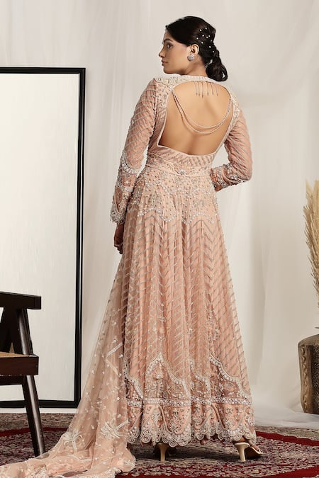 Salmon pink anarkali featuring bead, pearl & sequin embroidery in floral & zigzag patterns. Paired with a scallop hem dupatta for added elegance.