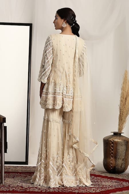 Ivory gharara set featuring a V-neck embroidered kurta with three-quarter sleeves. Paired with a sheer dupatta, showcasing floral and bead embellishments with scallop hem details.