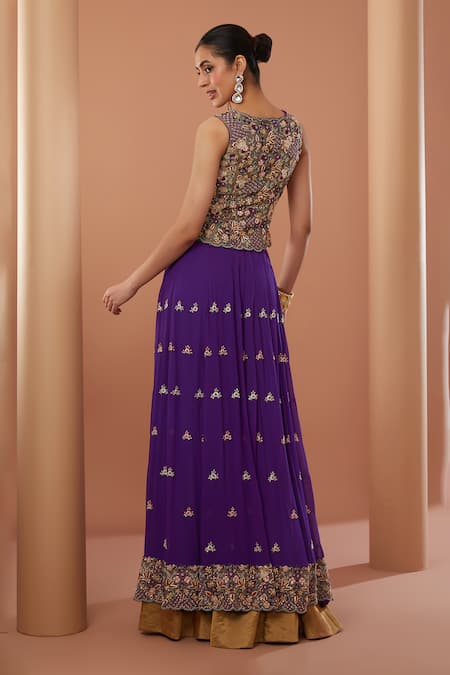 Purple georgette lehenga featuring hand embroidered floral and zardozi work. Paired with a matching embroidered padded koti blouse with scalloped hem.