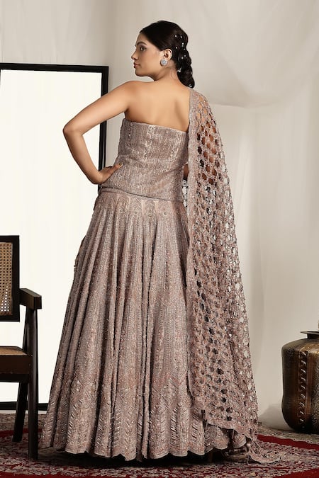 Gold lehenga featuring floral embroidery with scallop hem. Paired with a strapless corset and a cutwork embroidered dupatta.