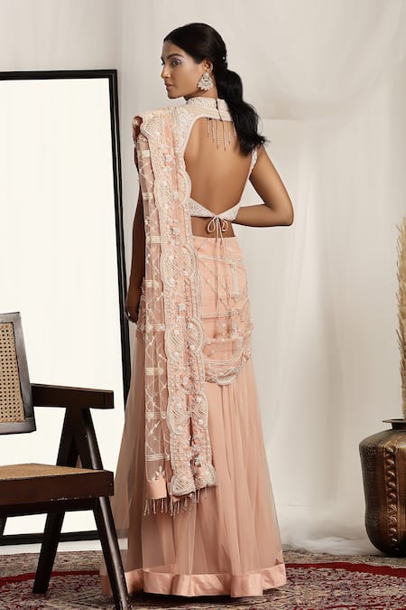 Salmon pink pre-draped saree featuring floral, pearl, and bead embroidery with a scallop hem. Paired with a back hook & eye closure blouse adorned with floral, pearl, and bead details along with tassels.